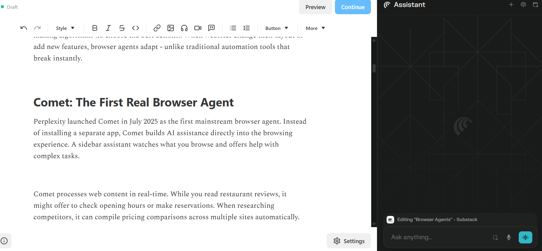 Perplexity launched Comet in July 2025 as the first mainstream browser agent. Instead of installing a separate app, Comet builds AI assistance directly into the browsing experience. A sidebar assistant watches what you browse and offers help with complex tasks.