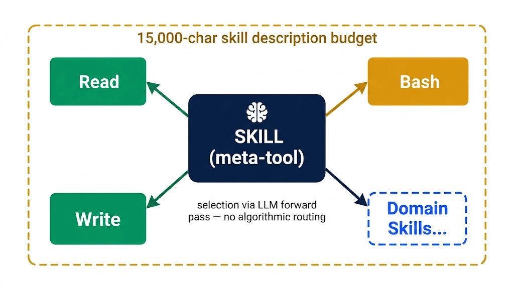 The meta-tool design means that individual skills do not appear in Claude’s tools array directly. Instead, a single Skill tool is listed alongside Read, Write, and Bash, and its description field contains a dynamically generated list of all available skills, their names and brief summaries, subject to a 15,000-character budget limit. Claude reads this list and uses its native language understanding to match user intent against skill descriptions. There is no algorithmic routing, no embedding-based semantic search, and no regex pattern matching at the application level. The selection happens entirely within the model’s forward pass through the transformer.