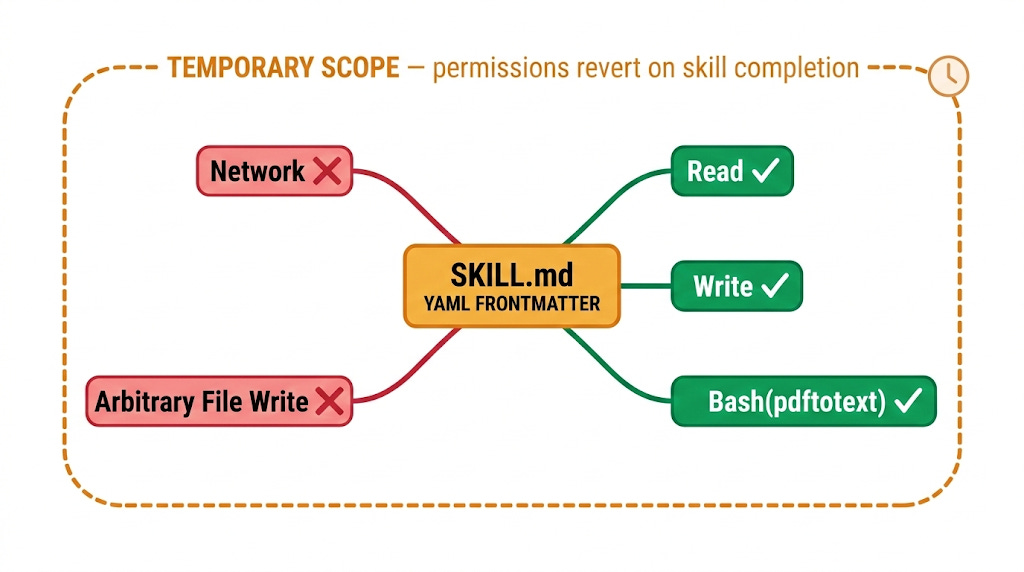 The execution context modification is the final piece. Skills specify, in their YAML frontmatter, which tools they are permitted to use Bash(pdftotext:*), Read, Write, or any subset of available operations. When the skill loads, a context modifier function pre-approves these tools for the duration of the interaction without requiring user confirmation for each invocation. The scope is temporary: once the skill completes, permissions revert. A PDF extraction skill cannot invoke network calls; a code analysis skill cannot write to arbitrary file paths. The surface area of each skill’s operation is precisely constrained by its author.
