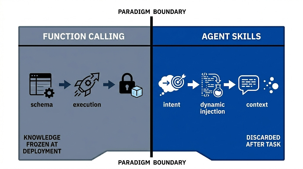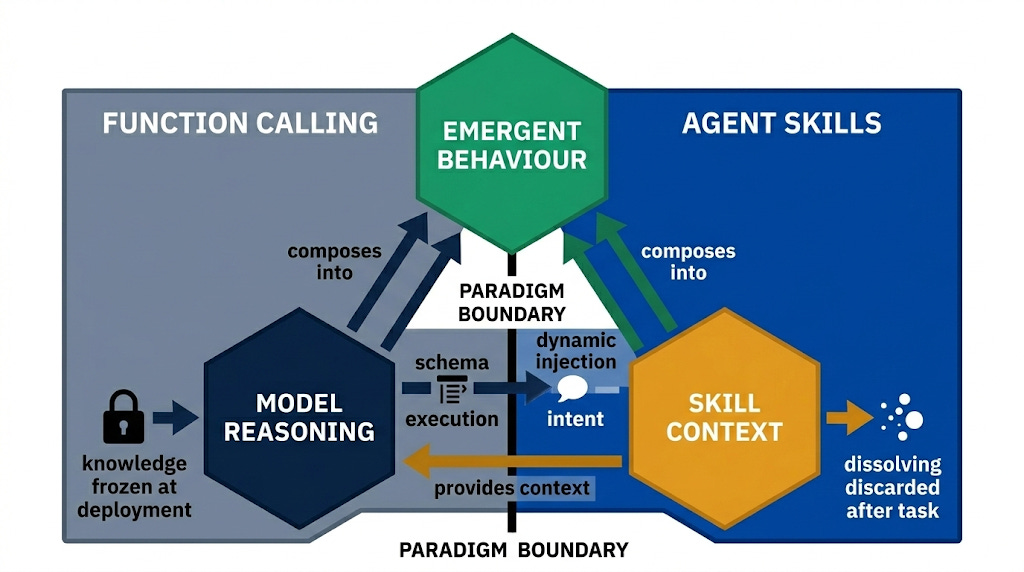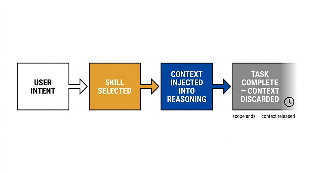 The Agent Skills architecture dissolves that constraint. Rather than treating specialised capability as executable logic, it treats it as prompt context, delivered at the moment of need, scoped to the task, and discarded once the interaction is complete.