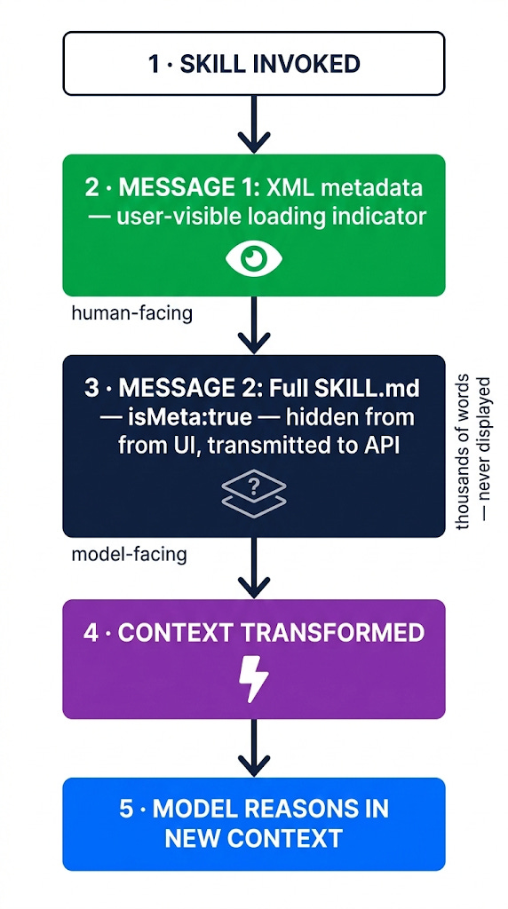 When a skill is selected and invoked, the system follows a sequence that departs radically from traditional tool execution. Rather than running code and returning a result, the Skill tool injects two user-role messages into the conversation history. The first contains concise XML metadata, a loading indicator visible to the user in the interface. The second contains the full skill prompt: potentially thousands of words of specialised instructions loaded from a SKILL.md file, set with an isMeta flag that hides it from the user interface while ensuring it is transmitted to the API. The model never runs the skill. The skill runs the model — by transforming the context in which the model reasons about the task.