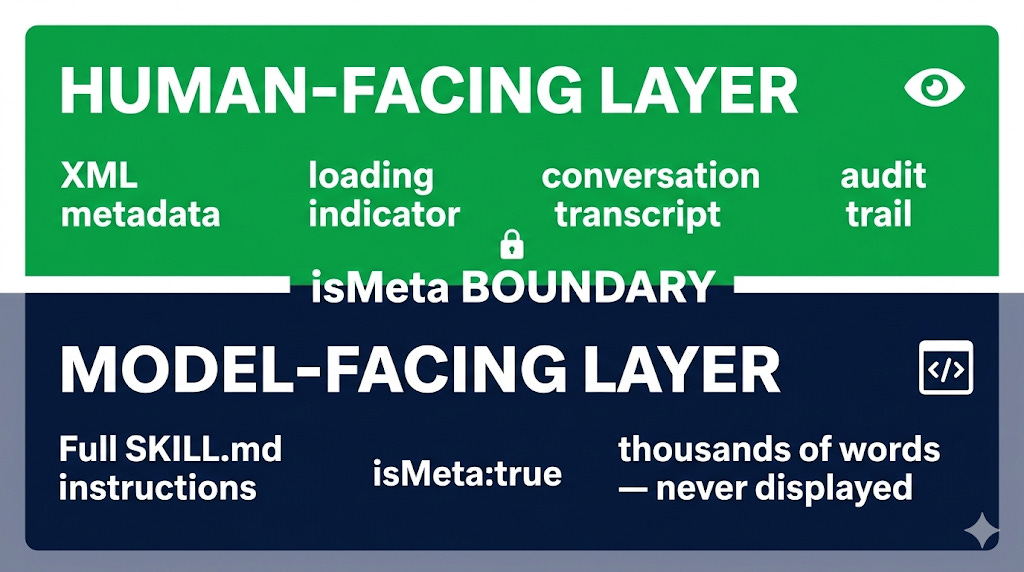 This dual-message architecture solves a genuine design problem. Users need transparency about which capabilities are active; Claude needs detailed instructions to execute specialist workflows. Collapsing both into a single message forces an impossible choice: either expose the full prompt in the interface, cluttering the transcript with thousands of words of internal AI instructions, or hide everything and eliminate the audit trail entirely. The isMeta flag enables a clean separation between human-facing communication and model-facing instruction that is elegant in its simplicity.